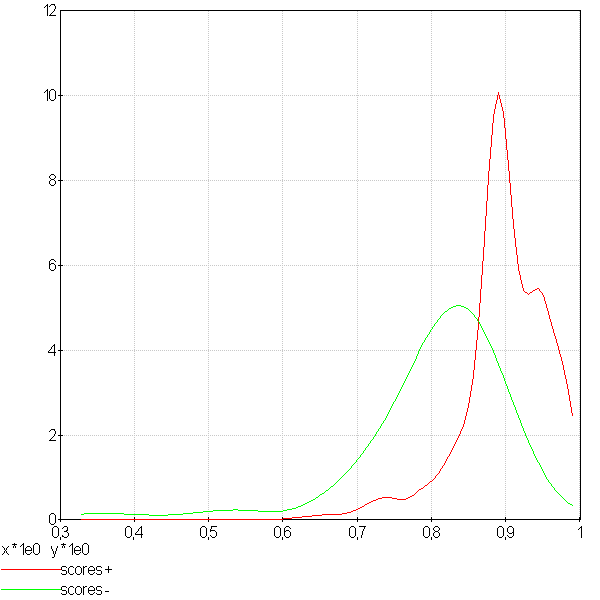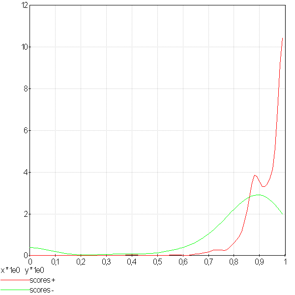 On appelle un mauvais score un score associé à un mauvais résultat, de même, un bon score est le score d’un bon résultat. Si le score est une probabilité, on s’attend à trouver les bons scores regroupés autour de la valeur 1. Si le score est un mauvais score, il devrait être plus proche de zéro. La figure qui suit montre des distributions obtenues pour deux problèmes différents. Dans les deux cas, le but recherché est la détermination d’un seuil séparant le score d’un bon résultat de celui d’un mauvais résultat. Lorsque ceci n’est pas possible, le score ne peut correspondre à un quelconque critère confiance.