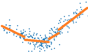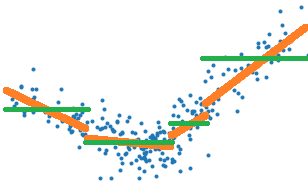 L’arbre de décision optimise la construction d’une fonction en escalier qui représente au mieux le nuage de points, les traits verts sur le graphe suivant, alors qu’il faudrait choisir une erreur quadratique qui corresponde aux traits oranges.