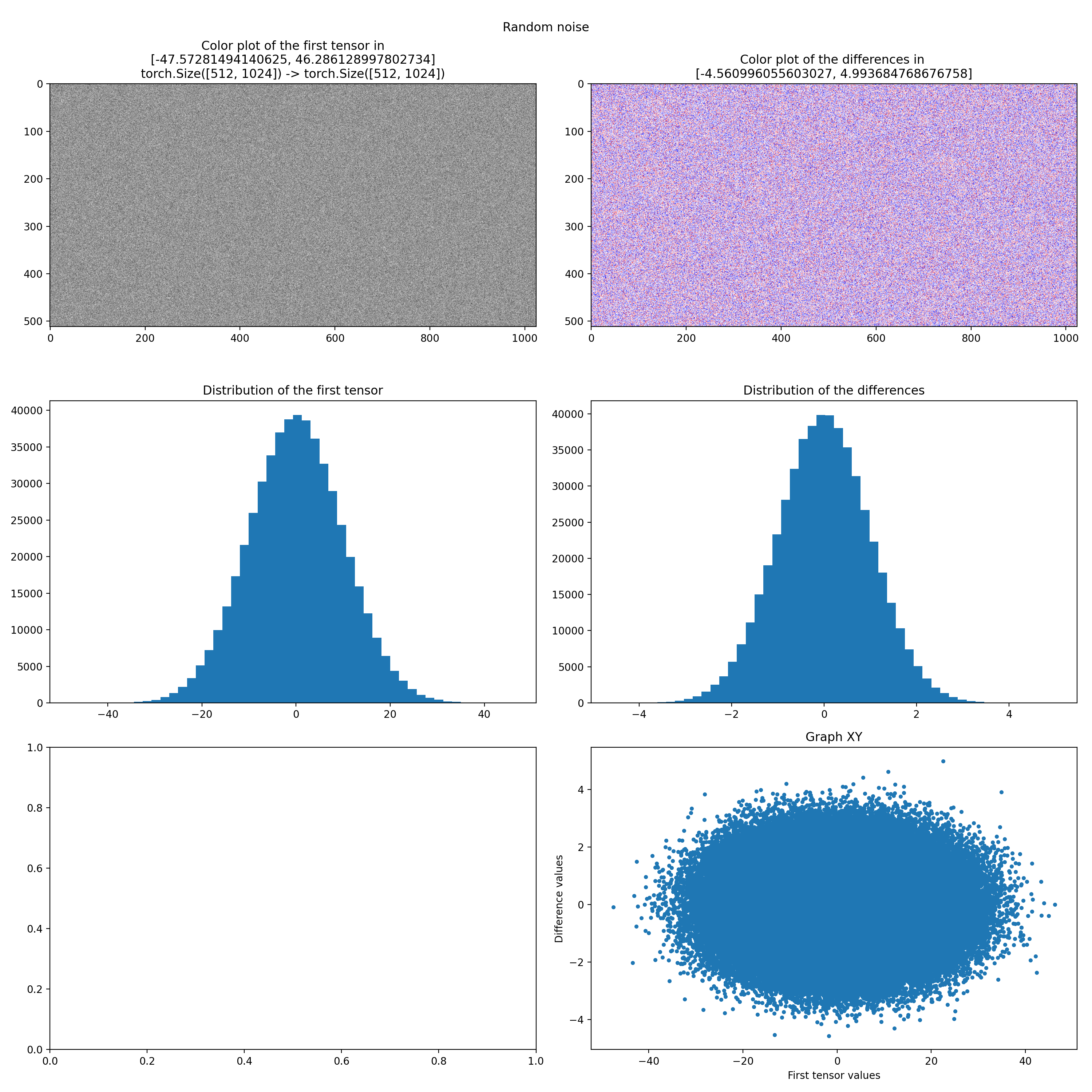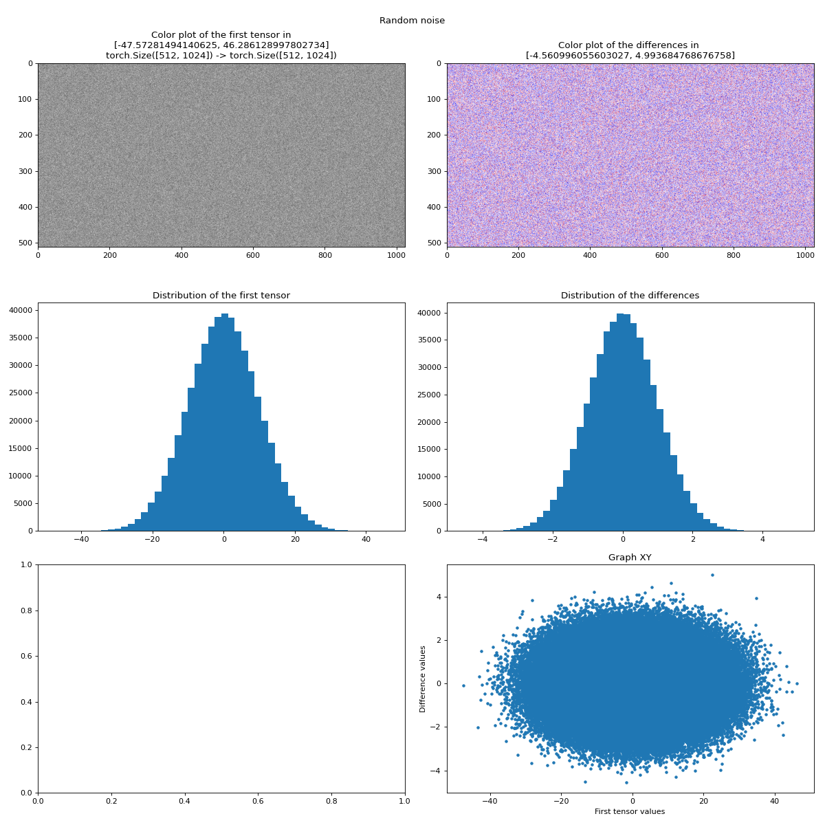 import torch from onnx_diagnostic.helpers.torch_helper import study_discrepancies t1 = torch.randn((512, 1024)) * 10 t2 = t1 + torch.randn((512, 1024)) study_discrepancies(t1, t2, title="Random noise")