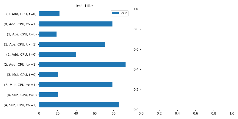 agg=True:import numpy as np from onnx import TensorProto import onnx.helper as oh from onnx.checker import check_model from onnx.numpy_helper import from_array import matplotlib.pyplot as plt from onnxruntime import InferenceSession, SessionOptions from onnx_diagnostic.helpers.rt_helper import js_profile_to_dataframe, plot_ort_profile def get_model(): model_def0 = oh.make_model( oh.make_graph( [ oh.make_node("Add", ["X", "init1"], ["X1"]), oh.make_node("Abs", ["X"], ["X2"]), oh.make_node("Add", ["X", "init3"], ["inter"]), oh.make_node("Mul", ["X1", "inter"], ["Xm"]), oh.make_node("Sub", ["X2", "Xm"], ["final"]), ], "test", [oh.make_tensor_value_info("X", TensorProto.FLOAT, [None])], [oh.make_tensor_value_info("final", TensorProto.FLOAT, [None])], [ from_array(np.array([1], dtype=np.float32), name="init1"), from_array(np.array([3], dtype=np.float32), name="init3"), ], ), opset_imports=[oh.make_opsetid("", 18)], ir_version=9, ) check_model(model_def0) return model_def0 sess_options = SessionOptions() sess_options.enable_profiling = True sess = InferenceSession( get_model().SerializeToString(), sess_options, providers=["CPUExecutionProvider"] ) for _ in range(11): sess.run(None, dict(X=np.arange(10).astype(np.float32))) prof = sess.end_profiling() df = js_profile_to_dataframe(prof, first_it_out=True, agg=True) print(df.head()) fig, ax = plt.subplots(1, 2, figsize=(10, 5)) plot_ort_profile(df, ax[0], ax[1], "test_title") fig.tight_layout()