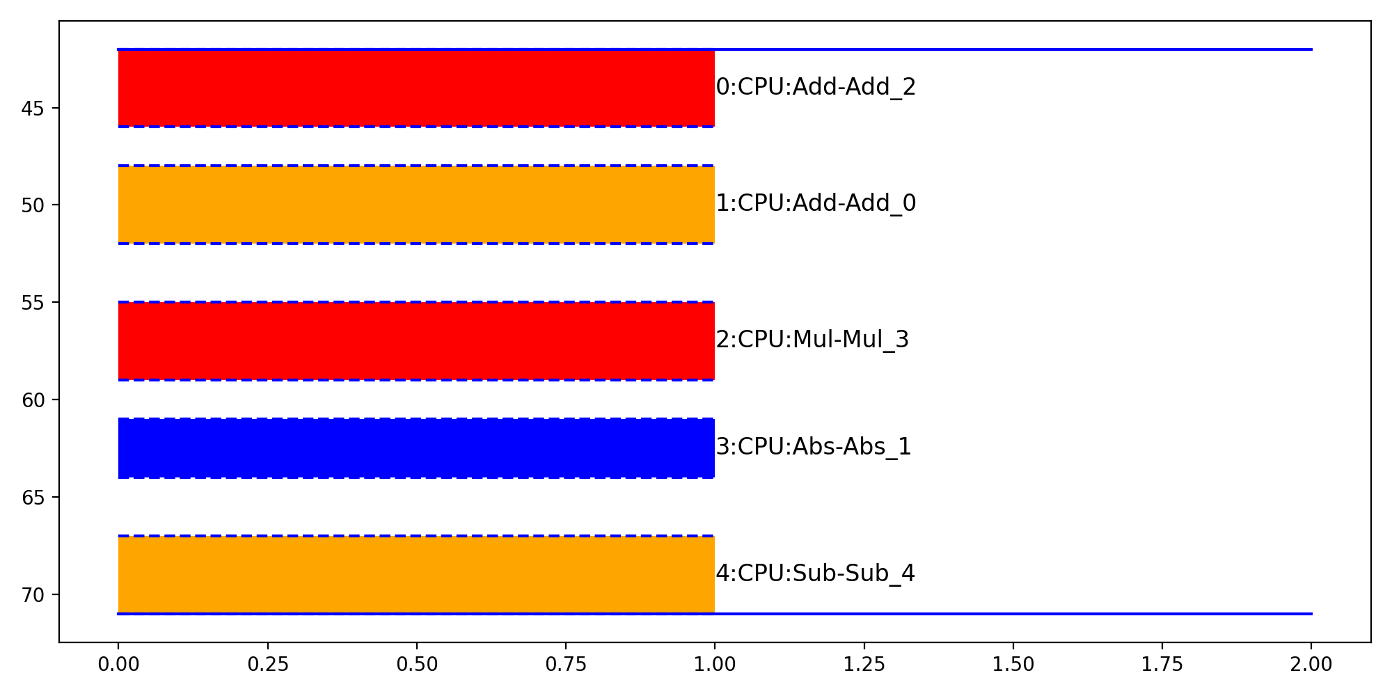 import numpy as np from onnx import TensorProto import onnx.helper as oh from onnx.checker import check_model from onnx.numpy_helper import from_array import matplotlib.pyplot as plt from onnxruntime import InferenceSession, SessionOptions from onnx_diagnostic.helpers.rt_helper import ( js_profile_to_dataframe, plot_ort_profile_timeline, ) def get_model(): model_def0 = oh.make_model( oh.make_graph( [ oh.make_node("Add", ["X", "init1"], ["X1"]), oh.make_node("Abs", ["X"], ["X2"]), oh.make_node("Add", ["X", "init3"], ["inter"]), oh.make_node("Mul", ["X1", "inter"], ["Xm"]), oh.make_node("Sub", ["X2", "Xm"], ["final"]), ], "test", [oh.make_tensor_value_info("X", TensorProto.FLOAT, [None])], [oh.make_tensor_value_info("final", TensorProto.FLOAT, [None])], [ from_array(np.array([1], dtype=np.float32), name="init1"), from_array(np.array([3], dtype=np.float32), name="init3"), ], ), opset_imports=[oh.make_opsetid("", 18)], ir_version=9, ) check_model(model_def0) return model_def0 sess_options = SessionOptions() sess_options.enable_profiling = True sess = InferenceSession( get_model().SerializeToString(), sess_options, providers=["CPUExecutionProvider"] ) for _ in range(11): sess.run(None, dict(X=np.arange(10).astype(np.float32))) prof = sess.end_profiling() df = js_profile_to_dataframe(prof, first_it_out=True) print(df.head()) fig, ax = plt.subplots(1, 1, figsize=(10, 5)) plot_ort_profile_timeline(df, ax, title="test_timeline", quantile=0.5) fig.tight_layout()