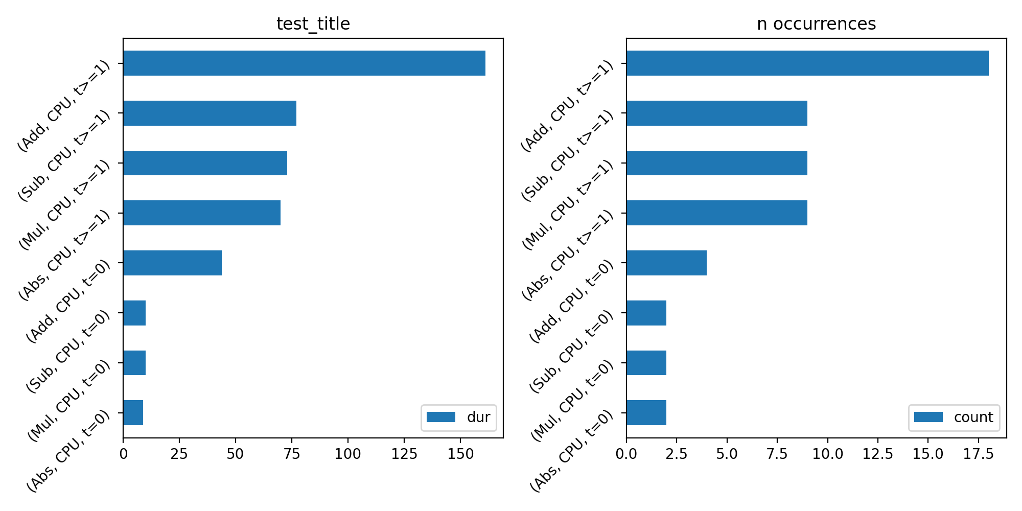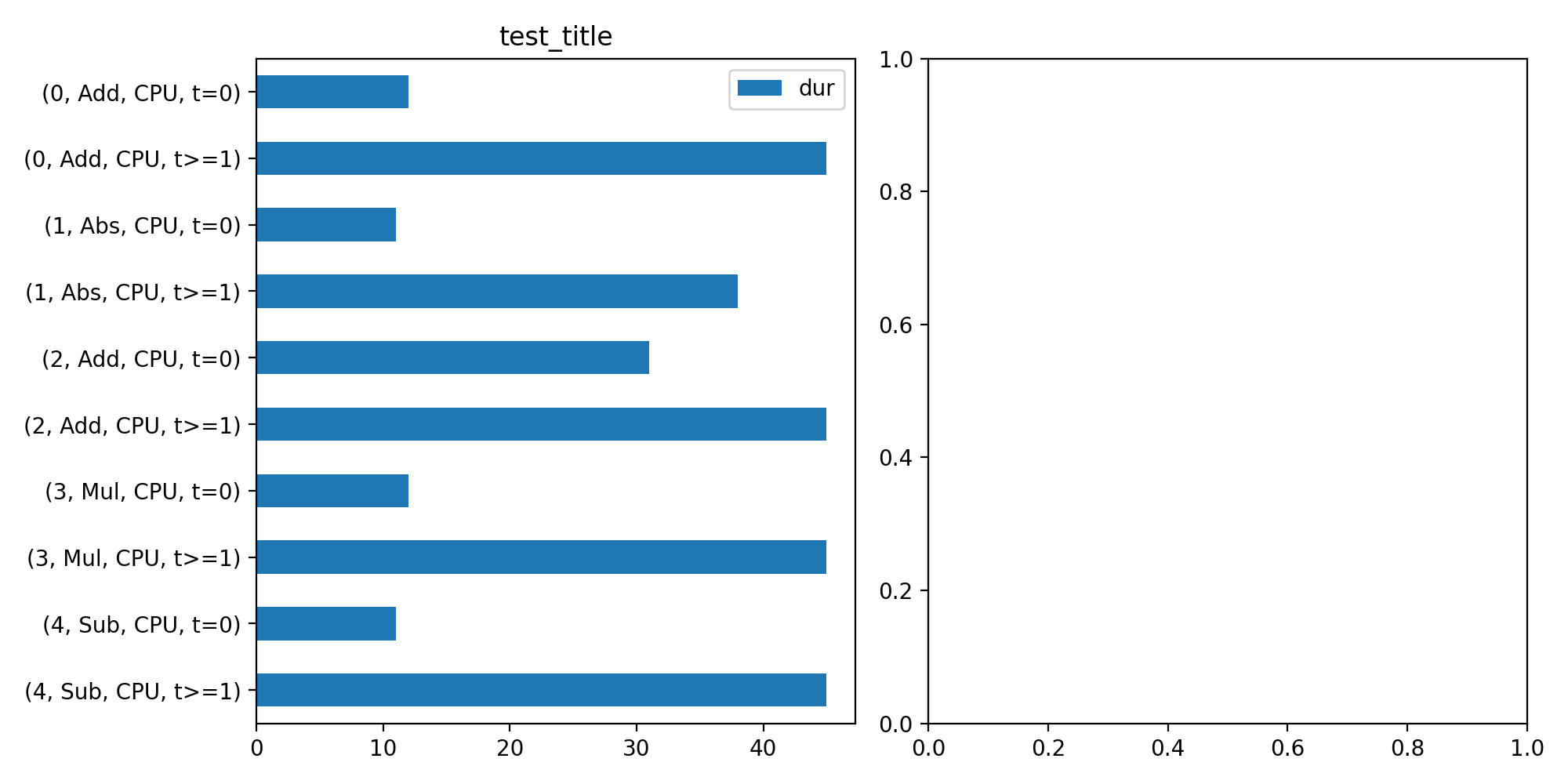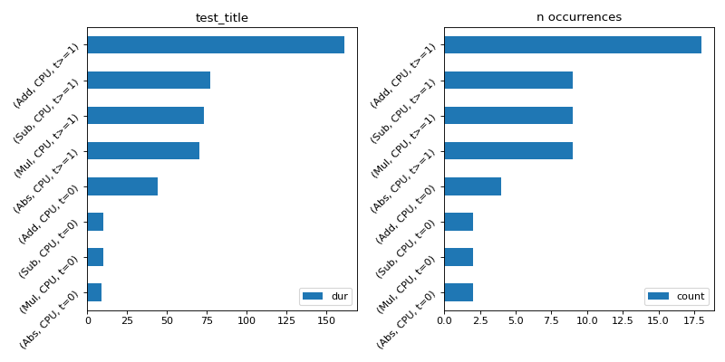 agg=True:import numpy as np from onnx import TensorProto import onnx.helper as oh from onnx.checker import check_model from onnx.numpy_helper import from_array import matplotlib.pyplot as plt from onnxruntime import InferenceSession, SessionOptions from onnx_diagnostic.helpers.rt_helper import js_profile_to_dataframe, plot_ort_profile def get_model(): model_def0 = oh.make_model( oh.make_graph( [ oh.make_node("Add", ["X", "init1"], ["X1"]), oh.make_node("Abs", ["X"], ["X2"]), oh.make_node("Add", ["X", "init3"], ["inter"]), oh.make_node("Mul", ["X1", "inter"], ["Xm"]), oh.make_node("Sub", ["X2", "Xm"], ["final"]), ], "test", [oh.make_tensor_value_info("X", TensorProto.FLOAT, [None])], [oh.make_tensor_value_info("final", TensorProto.FLOAT, [None])], [ from_array(np.array([1], dtype=np.float32), name="init1"), from_array(np.array([3], dtype=np.float32), name="init3"), ], ), opset_imports=[oh.make_opsetid("", 18)], ir_version=9, ) check_model(model_def0) return model_def0 sess_options = SessionOptions() sess_options.enable_profiling = True sess = InferenceSession( get_model().SerializeToString(), sess_options, providers=["CPUExecutionProvider"] ) for _ in range(11): sess.run(None, dict(X=np.arange(10).astype(np.float32))) prof = sess.end_profiling() df = js_profile_to_dataframe(prof, first_it_out=True, agg=True) print(df.head()) fig, ax = plt.subplots(1, 2, figsize=(10, 5)) plot_ort_profile(df, ax[0], ax[1], "test_title") fig.tight_layout()