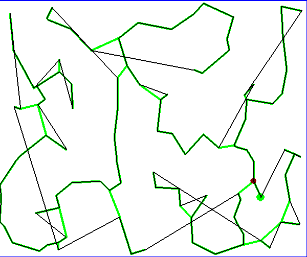 Résultat obtenu pour un ensemble de 300 villes, la solution retournée est obtenue rapidement mais présente des erreurs évidentes qu’il est possible de corriger en échangeant la position de noeuds dans le chemin. Les arcs verts font partie de l’arbre de poids minimal, les arcs noirs font partie du circuit hamiltonien. La figure montre un chemin hamiltonien obtenu pour 300 villes. Le coût de cet algorithme est en O(n).