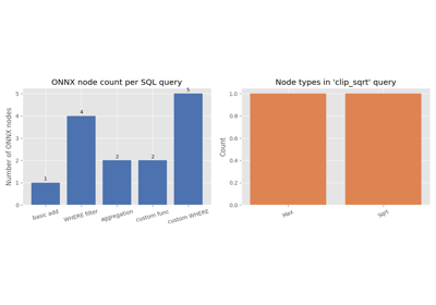SQL Gallery# Examples about converting SQL queries to ONNX graphs. SQL queries to ONNX SQL queries to ONNX Gallery generated by Sphinx-Gallery